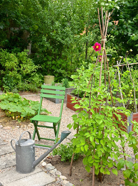 Den "röda" sorten visade sig istället ha en härligt chockrosa färg, som jag får säga är riktigt läcker. Jag stöttar upp den med ett hemmagjort klätterstöd, som egentligen var tänkt till bönor, fast det behövs egentligen inte. Nu ska det bli kul att se vad det blir av de gula också. Ni skymtar dem på bilden här ovanför i den mittersta pallkragen.