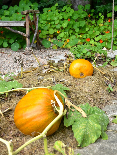 I pumpalandet börjar bladen vissna, men två stora pumpor ligger och tronar på ett tjockt lager av gräsklipp. Håller de sig fina ända till Halloween, tro?