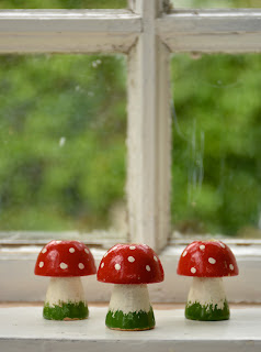 21) Tre små flugsvampar för julgransljus, som står i fönstret på glasverandan.