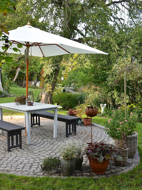 Sommarens största trädgårdsprojekt stod jag inte för själv. I mitten av juli rullade grävmaskin och stensättare in och påbörjade "Operation Uteplats", vilket vi väntat på under ett helt år. Efter förseningar orsakade av regn och rusk stod vår lilla piazza äntligen klar i slutet av månaden, och jag kunde "inreda" och så nytt gräs runt hela härligheten. Vi är sååå nöjda med resultatet!