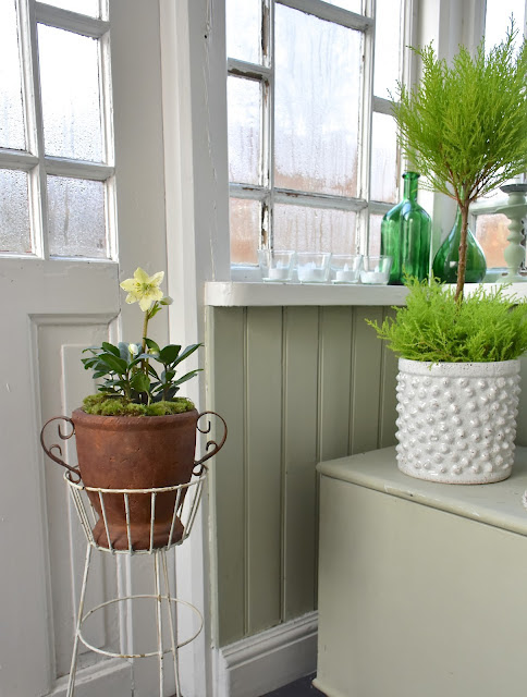 Jag smyger in advent med en vit julros (Helleborus niger) i fin gjutjärnskruka med lite kuddmossa runt kanterna. (Kanske lite onödigt att "offra" kuddmossa på det här sättet, men jag hade ingen annan när jag planterade över den.) Glasverandan erbjuder perfekt placering för julrosor, eftersom den mår bäst när det är rejält svalt. Den tål faktiskt till och med någon minusgrad, men riktigt så kallt blir det ändå inte på verandan.