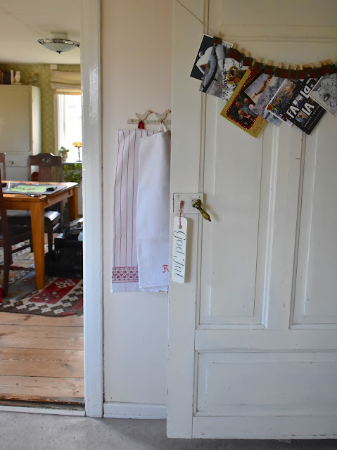 De kort som fortfarande hittar till Solhäll hamnar alltid på hedersplats på köksdörren. Snöret med de små "klädnyporna" är nog egentligen tänkt att användas som adventskalender, men de passar ypperligt att hänga upp julkort i. (På matbordet i gröna rummet pågår speltillverkning mitt i julstöket, hihi!)