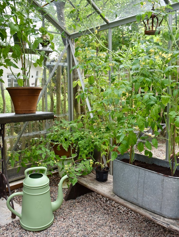 Annars tycker jag som vanligt mest att det är roligt att använda växthuset som mitt lilla potting shed (planteringsbod). Här förvarar jag krukor, flaskor med gödning, material för uppbindning, saxar, blompinnar och annat som man ändå kan behöva i en köksträdgård. Jag är den första att erkänna att jag inte är någon trädgårdsmästare. Snarare en trädgårdsscenograf. För mig är det viktigaste med trädgård att skapa mysiga miljöer, som jag trivs att vara i. Och jag trivs faktiskt i mitt lilla växthus. Allra mysigast är det att vara här inne när regnet smattrar på glaset.