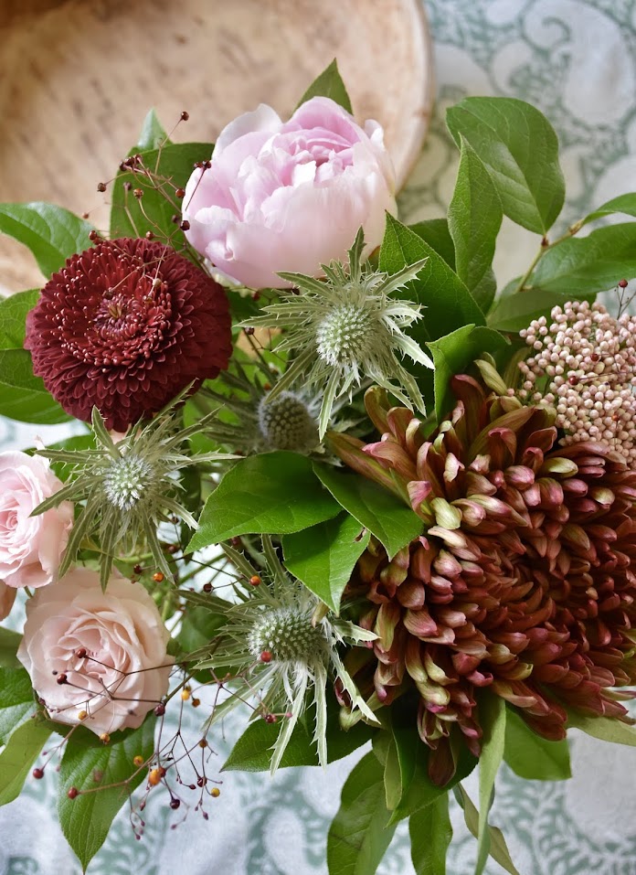 Fredag igen, tjohooo! Veckans helgbukett införskaffades från byns finaste lilla blomsteraffär redan igår. Den här gången blev det en färdigbunden bukett med bland annat rosor, pion, tistel och krysantemum. Rosa och vinrött är en härlig färgkombination!