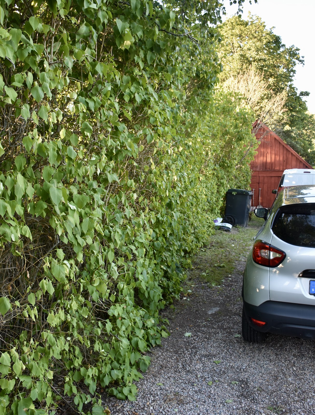 Vår uppfart är allt annat än glamorös och mest i väntan på bättre tider. Det finns en plan för att ordna till den på sikt, men idag gjorde vi iallafall en liten insats för mänskligheten och gick loss på den långa syrenhäcken med häcksax. Vi klippte förvisso inte ner den så mycket på höjden, men vi klippte in den desto mer på bredden. Det var välbehövligt, för det började bli trångt att öppna dörren på förarsidan av bilarna. Efteråt ser det mest risigt ut, men det där brukar rätta till sig på en vecka eller två. Vi lyckades knöka ner allt klipp i trädgårdstunnan, så den är full till bredden nu. Smidigt med den där tunnan, ändå.